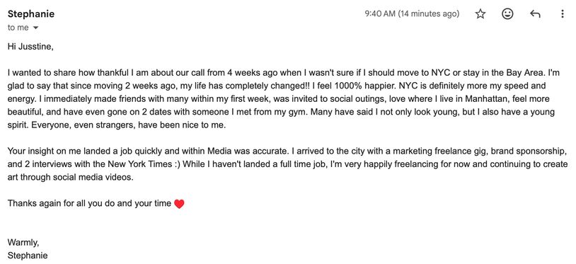 How I work: First, I tell you what your spirit guides and teachers most want for you to know now. That usually includes past lives affecting you presently. I give you a summary of what’s going on with you spiritually, and how that's affecting you in the physical. Next, you get to ask specific questions. I can look at relationships, career, family, pets, real estate, investments. As long as you have specific questions, I can get you specific answers. Then, I walk you through an eyes closed healing that helps you let go of any energy that's no longer serving you.